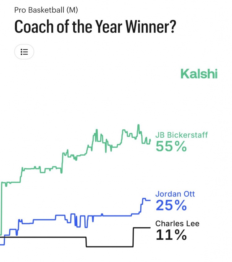 2月3日讯 预测数据平台Kalshi Sports显示,活塞主帅比克斯塔夫目前是年度最佳教练的头号热门人选。