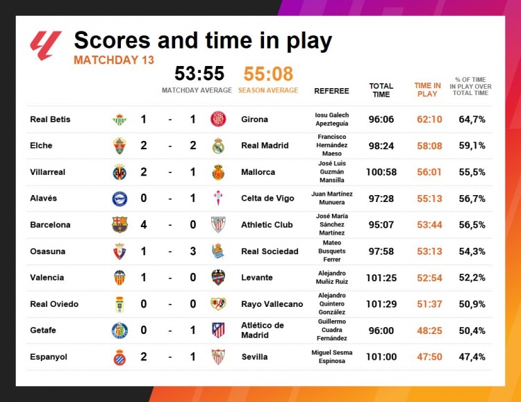 11月25日讯 Opta统计了西甲第13轮比赛的净比赛时间,本轮场均净比赛时间为53分钟55秒,而本赛季西甲场均净比赛时间为55分钟8秒。